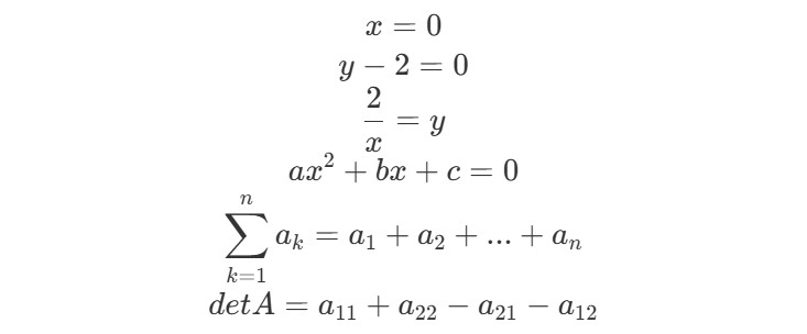 x = 0 \\ y - 2 = 0 \\ \frac {2}{x} = y\\ ax^2 + bx + c = 0 \\ \sum_{k=1}^{n}a_k = a_1 + a_2 + ... + a_n\\ det A = a_{11} + a_{22} - a_{21} - a_{12}x = 0 \\ y - 2 = 0 \\ \frac {2}{x} = y\\ ax^2 + bx + c = 0 \\ \sum_{k=1}^{n}a_k = a_1 + a_2 + ... + a_n\\ det A = a_{11} + a_{22} - a_{21} - a_{12}- 改行は