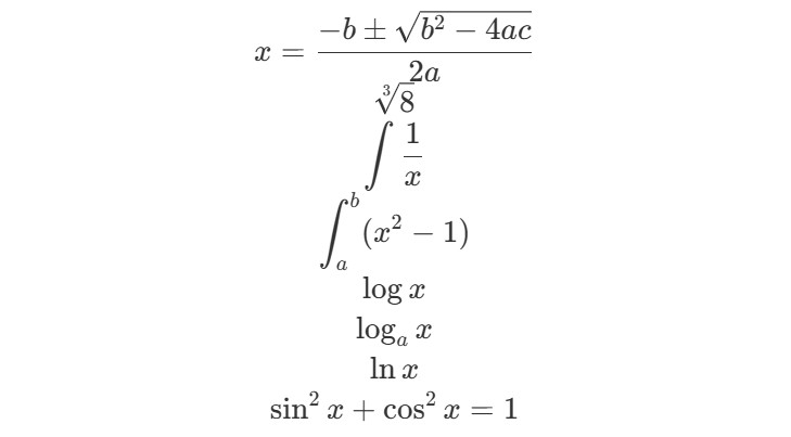 x = \frac {-b \pm \sqrt {b^2 - 4ac}}{2a}\\ \sqrt[3] 8\\ \int \frac {1}{x}\\ \int_a^b (x^2 - 1)\\ \log x\\ \log_a x\\ \ln x\\ \sin^2 x + \cos^2 x = 1x = \frac {-b \pm \sqrt {b^2 - 4ac}}{2a}\\ \sqrt[3] 8\\ \int \frac {1}{x}\\ \int_a^b (x^2 - 1)\\ \log x\\ \log_a x\\ \ln x\\ \sin^2 x + \cos^2 x = 1